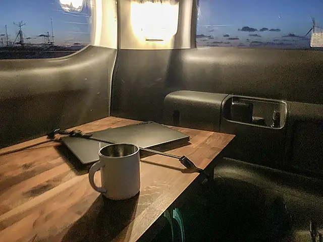 後部座席の机でコーヒーを。